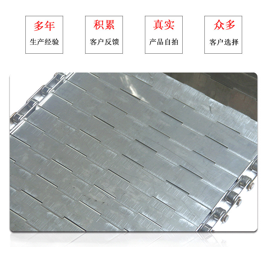 鏈板輸送帶:是采用不銹鋼板沖壓成型,鏈條傳動(dòng),每節(jié)由6-10mm支撐桿連接,其運(yùn)動(dòng)平穩(wěn)、力量大,適合用于輸送細(xì)小的高密度物件,輸送過程中運(yùn)轉(zhuǎn)平穩(wěn),安裝更換方便,成本高,使用壽命較長。